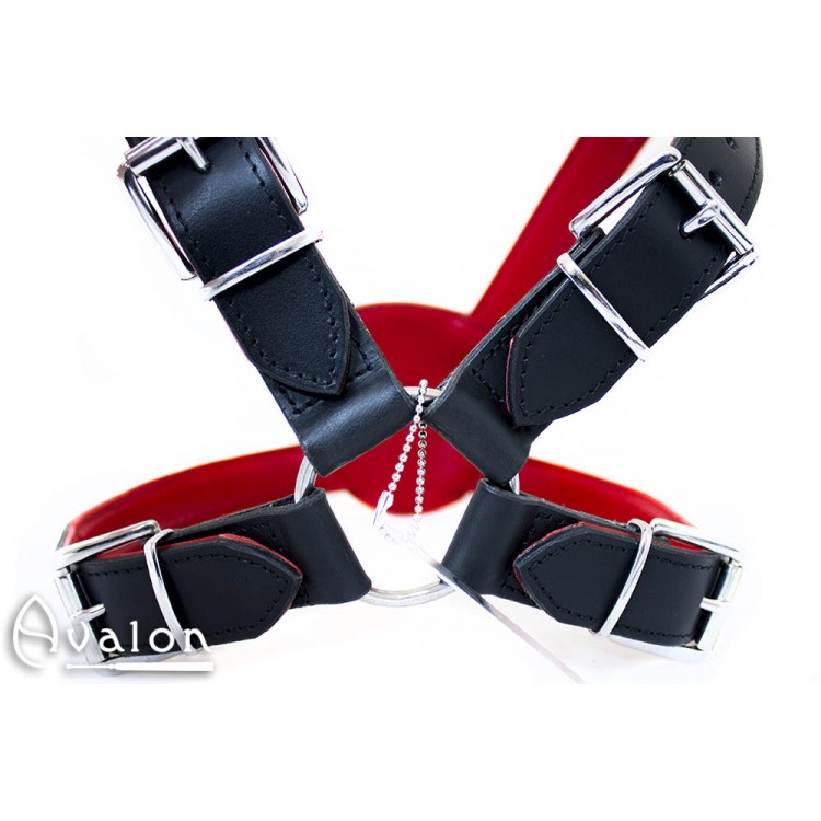 Harnessen er i rødt og sort lær og kan lett justeres med spenner for enkel tilpassing.